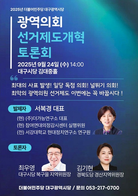 더불어민주당 대구시당이 24일 ‘광역의회 선거제도 개혁 토론회’를 열고, 지역 정치 다양성과 경쟁 회복을 위한 제도 개선 방안을 논의한다.