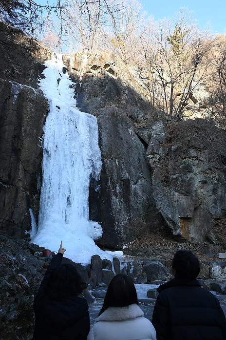 최근 폭포수가 꽁꽁 얼어붙어 빙벽이 절정을 이루고 있어 겨울 관광객들의 포토존으로 인기를 끌고 있다.