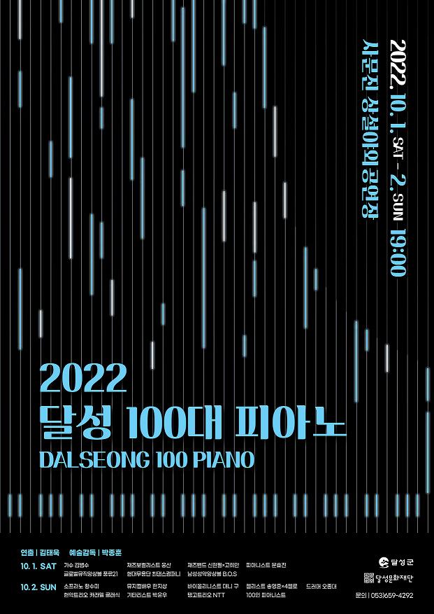 달성문화재단(이사장 최재훈)이 주관하는 달성군의 문화브랜드이자 지역대표축제인 "2022 달성 100대 피아노"가 오는 10월 1일(토) ~ 2일(일) 양일간 사문진 상설야외공연장에서 개최된다고 30일 밝혔다.