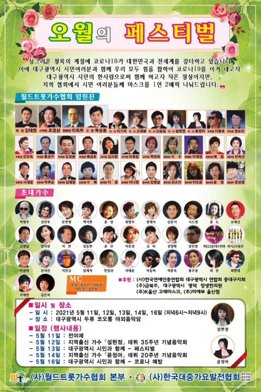 (사)월드트롯가수협회는 대구시민을 위해 코로나 예방을 위한 마스크도 시민들에게 나눠 줄 예정이다.