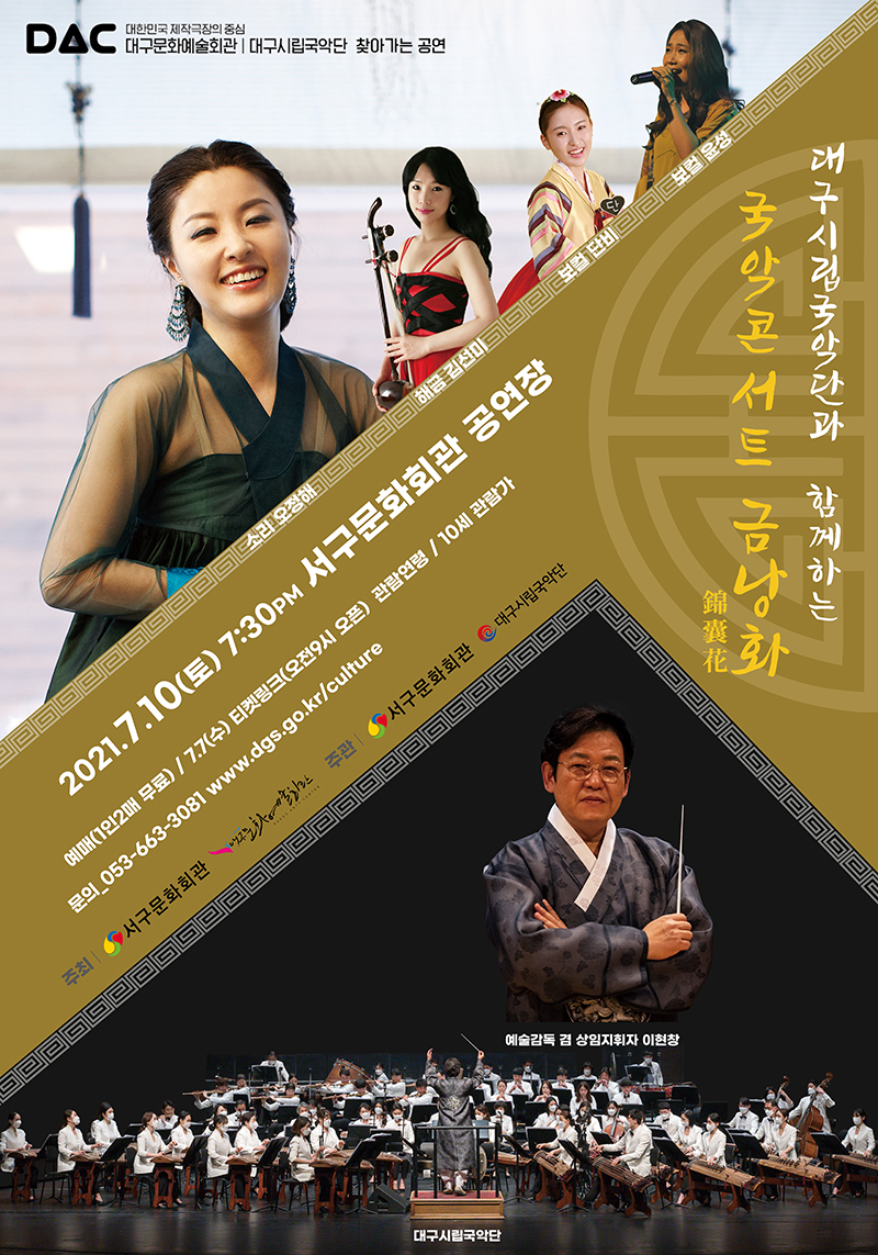 지역 최고의 국악관현악 단체인 대구시립국악단(예술감독 이현창)과 국악인 오정해, 해금 김선미, 지역보컬 단비, 윤성이 함께하는 국악콘서트가 서구문화회관에서 펼쳐진다.